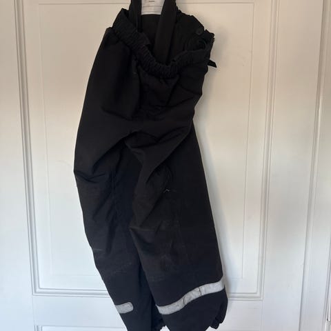 Polarn O. Pyret utebukse i svart for barn, unisex, størrelse 122. Buksen er laget i slitesterk polyester og har justerbare seler og strikk nederst på bena for å holde buksen på plass. Den har forsterkninger på knær og sete, samt refleksdetaljer på bena for bedre synlighet. Passer godt som ytterbukse til bruk i barnehage, skole og fritid i kjøligere og våte perioder.