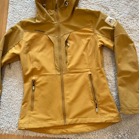 lett dunjakke for dame i størrelse M. Jakken er quiltet med tynne horisontale paneler og har høy krage. Den er gul og har glidelås i front samt to sidelommer med glidelås. Modellen egner seg til fottur og annen lett friluftsbruk, og kan brukes som ytterjakke eller mellomlag avhengig av vær og temperatur.
