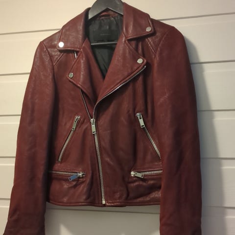 Kort, rød skinnjakke til dame størrelse 38. Selges fordi den ikke passer. Brukt to ganger. Som ny.