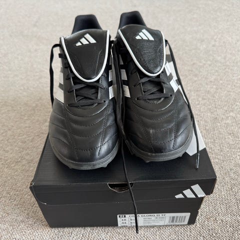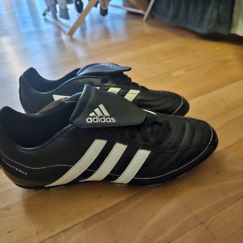 Adidas fotballsko for kunstgress i svart farge, størrelse 42 (US 8,5 / UK 8). Overdel i syntetisk materiale med quiltet mønster over forfot og klassisk tunge med snøring. Yttersåle med mange små knotter tilpasset spill på kunstgress eller hardt underlag.
