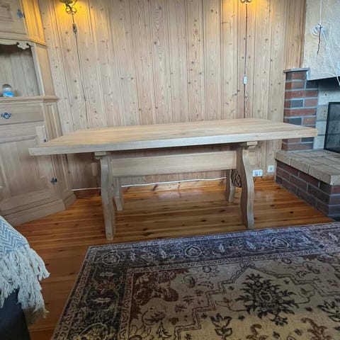 Pent brukt kjøkkenbord, kjøpt i ca 1997. Grønnsåpe skuret bordplate. Størrelse (BxLxH) 90x170x75.