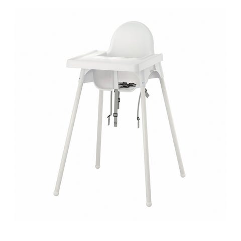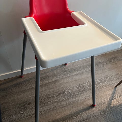 Chicco høy barnestol i blå plast med hvit matbrett. Stolen festes til en vanlig stol med stropper under og bak setet. Den har sikkerhetssele for barnet og justerbare armlener. Setet kan brukes både med og uten brett, og kan foldes sammen for enklere oppbevaring og transport. Egnet som spiseplass for små barn ved bordet.