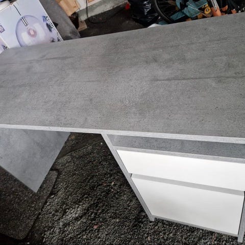 Praktisk skrivebord med vinkel som passer fint i hjørne, men kan også stå frittstående. Hyller med dør som kan dras til begge sider.