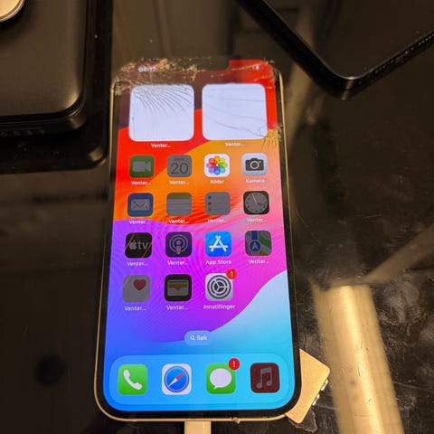Apple iPhone 13 Pro Max smarttelefon. Modellen har stor skjerm, trippelt hovedkamera og frontkamera i skjermen. Enheten har flate kanter og bakside med kameramodul øverst til venstre. Egnet til vanlig bruk som ringing, meldinger, surfing, sosiale medier og bilde- og videoopptak. Basert på bildene har telefonen synlige skader på baksiden og rundt kameramodulen, skjerm er ødelagt selges som dele tlf