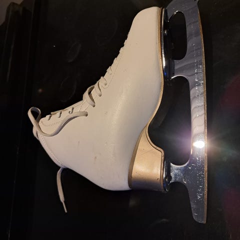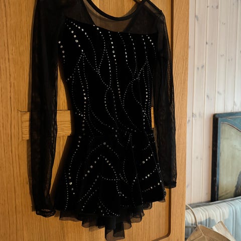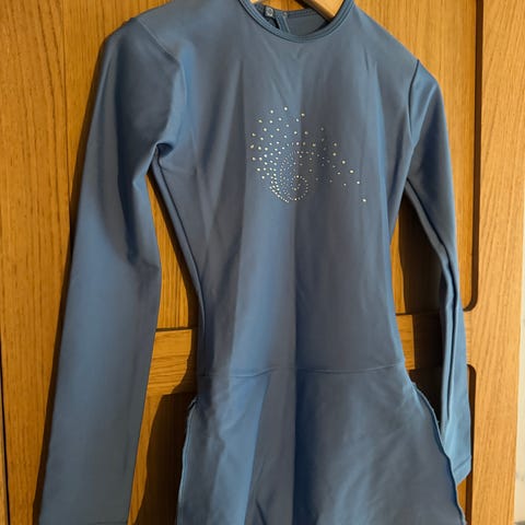 Nydelig kunstløp kjole i blått fra Jerry’s. Drakten har innebygd truse og utsvingt skjørt. Overdelen har glitrende detaljer og er ermeløs med høy hals. Materialet ser ut til å være elastisk stoff som gir god bevegelsesfrihet på isen. Passer til trening og oppvisning innen kunstløp og andre typer skøyter. Usikker på størrelsen, men passer str 10-12 år.