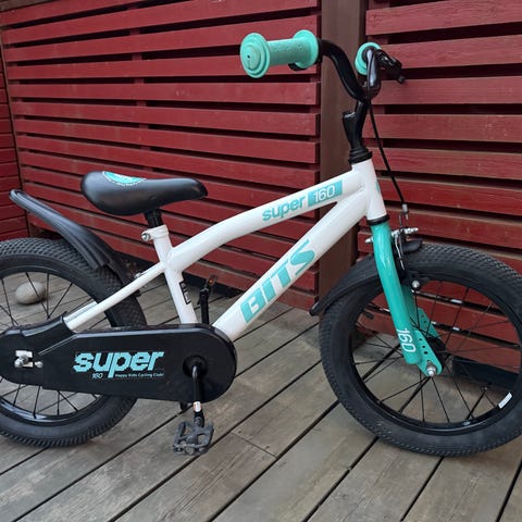 Bits Super 120 barnesykkel med 12" hjul. Sykkelen har hvit ramme med rosa detaljer, styre med håndtak i rosa, ringeklokke og støttehjul bak. Kjedet er dekket av kjedekasse for økt beskyttelse. Egnet som første sykkel for mindre barn som trenger støttehjul under sykling.