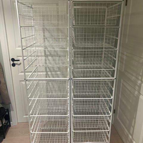 To høye seksjoner (174 cm) fra Elfa med til sammen 18 kurver (14 stk dype og 6 stk lave)