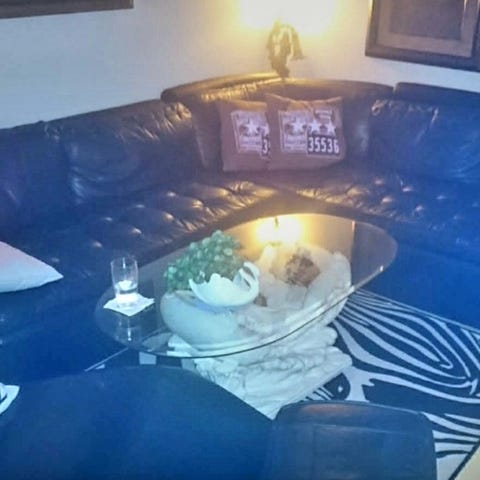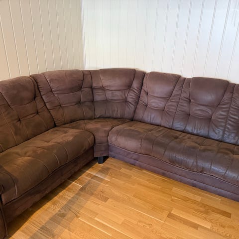 Stor hjøresofa i skinn kjøpt på Fagmøbler. Den er litt slitt i det ene setet. Men ellers godt polstret og god å sitte i. Litt usikker på hva slags skinn det er i den.
