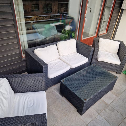 Som vist på bildene er settet godt brukt - sitteputer for sofa og en av stolene kan følge med, men se på filmen (QR kode fra Instagram) hvor fint det kan bli! 🤩