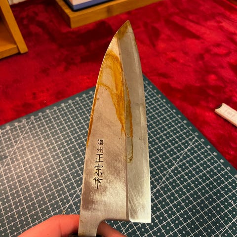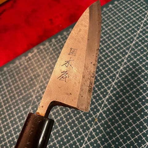 Importert kjøkkenkniv fra Japan. Type Deba. Kniven er brukt på profesjonelt kjøkken og har en egen Ju-ju som bare må oppleves. Her er det mye svette og blod som har satt sitt preg på bladet.