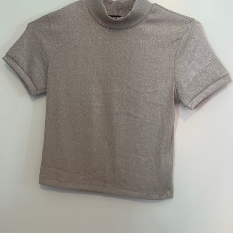 Vakker beige ribbet T-skjorte med rund krage. Størrelse M.