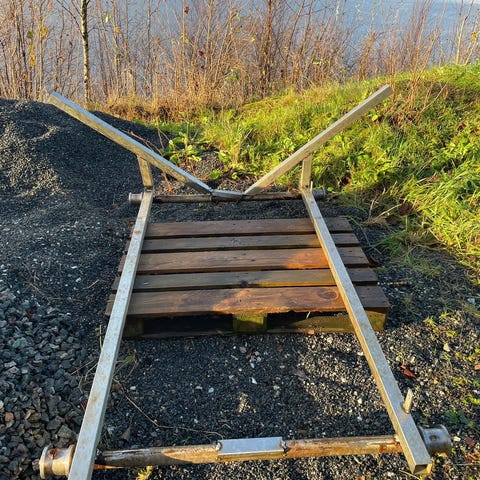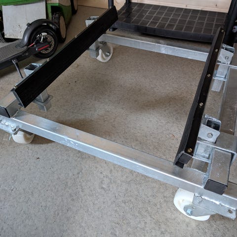 Tralle for oljefat i metall med gul ramme. Trallen har buet bæreflate tilpasset rundt oljefat og fire små hjul under for enkel forflytning. Egnet til oppbevaring og transport av gassflasker eller lignende sylindriske beholdere på jevnt underlag. Metallkonstruksjonen gir stabilitet ved bruk.