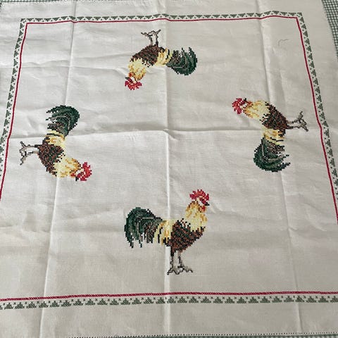 Selger en firkantet pen påske duk i størrelse 83x83 cm i koselig påske motiv. Den har et koselig påske motiv i hvert hjørne og en blå klokke i mellom. Den har et fint hullmønster rundt hele duken. Den er ikke håndbrodert. Duken er knapt brukt, så har nok bare ligget i en skuff.