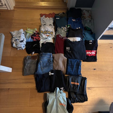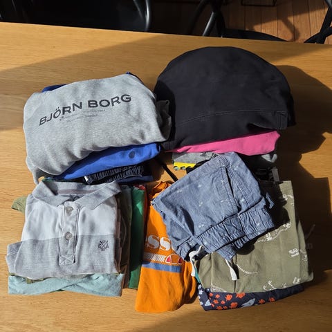 Inneholder skjorter, bukser, gensere, tshirt og shorts. Mye Basic. Litt dino print, marvel genser.