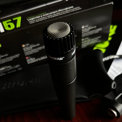 Shure SM57 dynamisk instrumentmikrofon i svart utførelse. Mikrofonen er designet for forsterkning og opptak av instrumenter og kan også brukes til tale. Standard XLR-tilkobling. På bildene vises flere mikrofoner, oppbevaringsetuier og tilbehør som vindhette og brakett. Passer til bruk i øvingslokale, studio og live-lydoppsett der det er behov for en retningsbestemt dynamisk mikrofon.