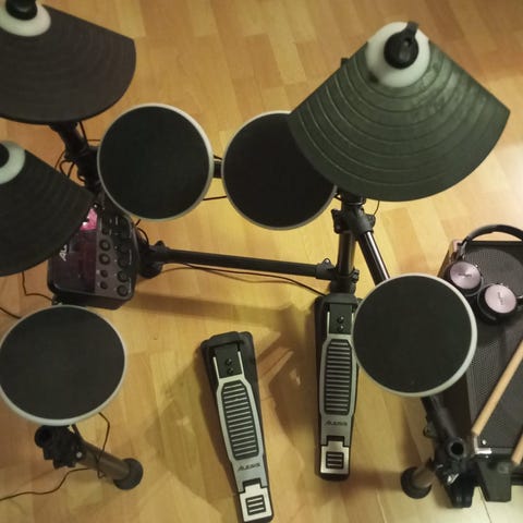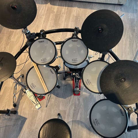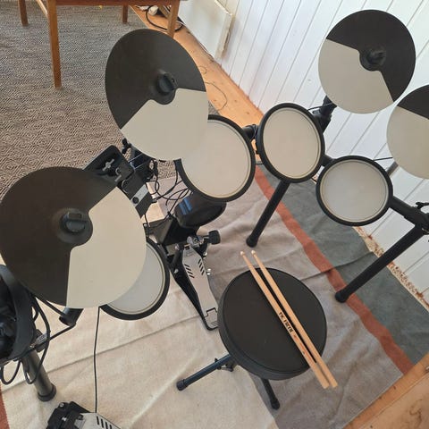 Her får du med alt du trenger for å komme igang; trommesettet, stol, hodetelefoner og trommestikker.