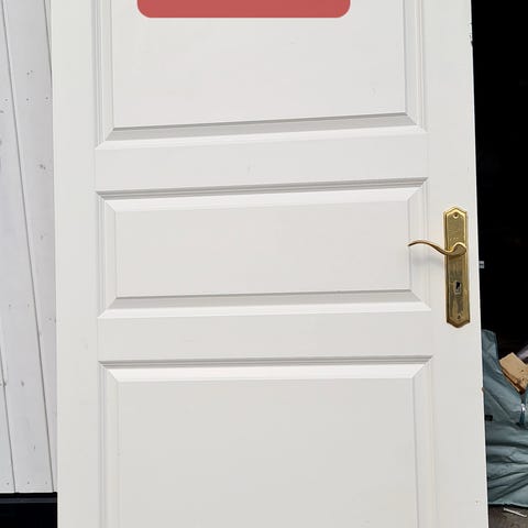 Harmonie dør 90x210 med karm, et lite bruksmerke nederst ellers grei dør. Massiv innedør