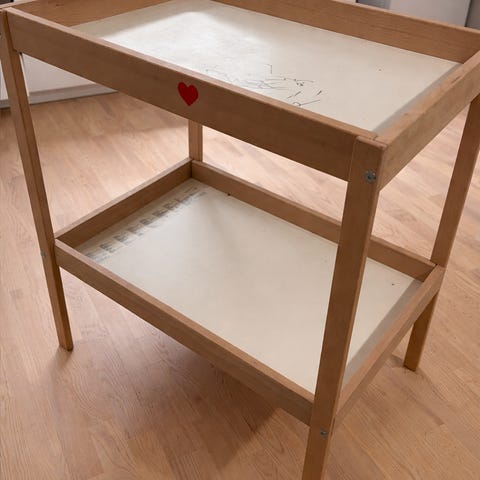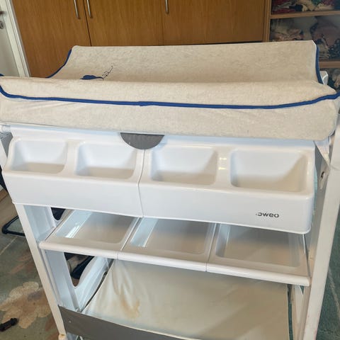 JLY stellebord med hylle i grå farge. Stellebordet har en åpen hylle nederst som gir plass til oppbevaring av bleier, klær og annet stelleutstyr. Øverst er det plass til stellematte, som på bildene vises med en lys, stripete matte. Bordet er beregnet for bruk til stell av baby og småbarn, og kan plasseres på bad, barnerom eller annet egnet rom med god plass rundt. Konstruksjonen er enkel og rettlinjet, med fire bein og rammeverk som gir stabilitet under stell.