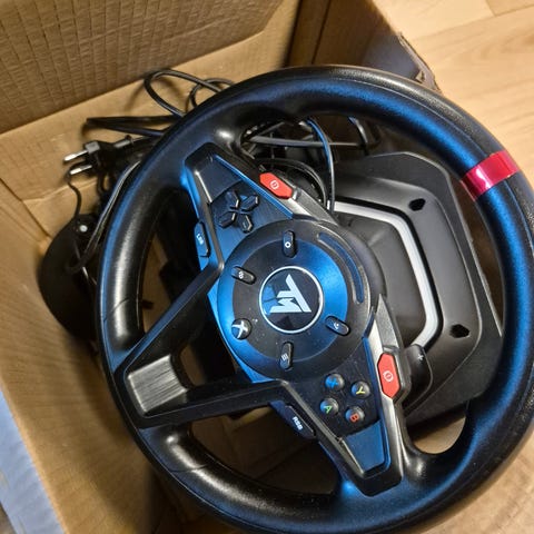 Thrustmaster T128 ratt og pedaler til PC og Xbox. Dette er veldig lite brukt og fremstår som nytt. Jeg har brukt bandasje på rattet, så det er helt strøkent.