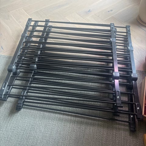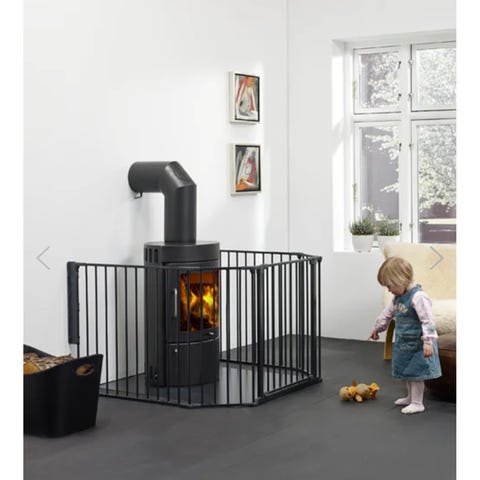 BabyDan Configure XL sikkerhetsgrind i svart metall. Grindløsningen består av flere seksjoner som kan settes sammen etter behov for å sperre av større områder, for eksempel rundt peis, kjøkken eller trapper. Egnet for bruk innendørs for å hindre at små barn eller valp får tilgang til utsatte soner i hjemmet. Grindseksjonene kan justeres i vinkel og festes i vegg med medfølgende veggfester, og har en dørdel som kan åpnes for enkel passasje av voksne.