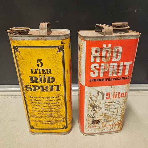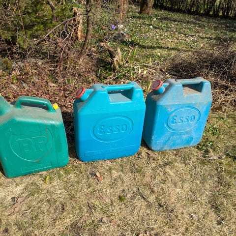 Esso bensinkanne og olje-/bensinkanner metall rød og hvit