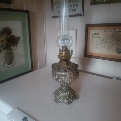 God stand. Trenger vask og stell. Kosmos brenner står det på veke skruen. Total høyde med glasset. 43 cm.