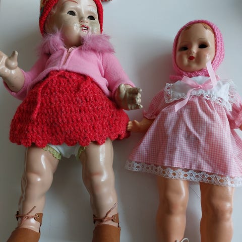 Smådukker, den lengste er kun 8 cm. Dukkene er fra forskjellige tidsaldre. De nyeste er hekledukkene fra 80-tallet. Resterende er fra ca 60 og 70-tallet. Selges samlet for 200,- Kan sendes mot porto eller hentes.