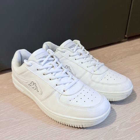 Størrelse 42. Svart med detaljer i oransje og hvitt.
