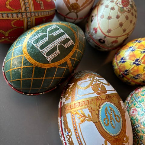 Stort påskeegg i metall med faberge-stil design i relieff