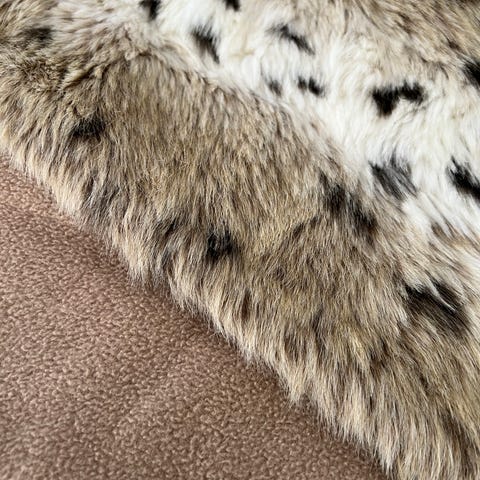 Mønster i «pels» på ene siden, fleece på baksiden. Grå/blå/petrol farge.