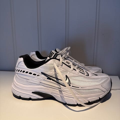 Nike løpesko i størrelse 40. Skoene er hvite med blå Nike-logo og detaljer, samt yttersåle i sort, hvitt og blått. Overdelen ser ut til å være i pustende mesh med syntetiske forsterkninger. Modellen er laget for løping og egner seg til bruk på asfalt og andre harde underlag. Snøring i front for justerbar passform.