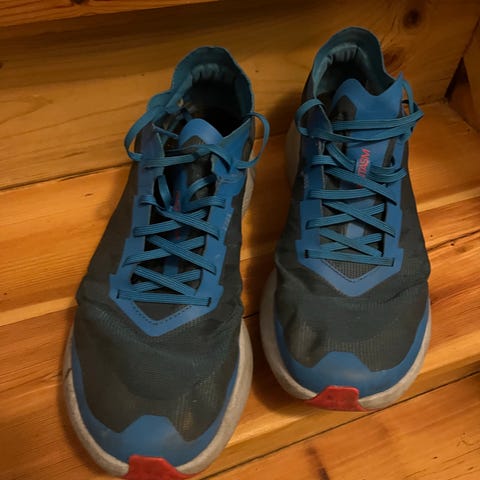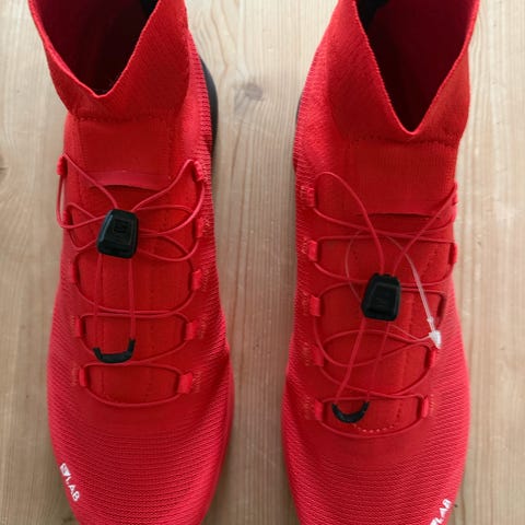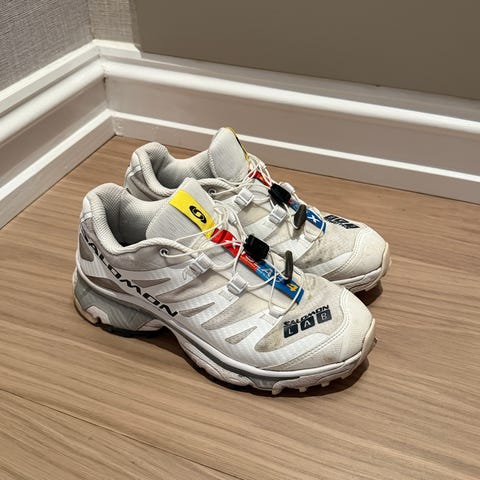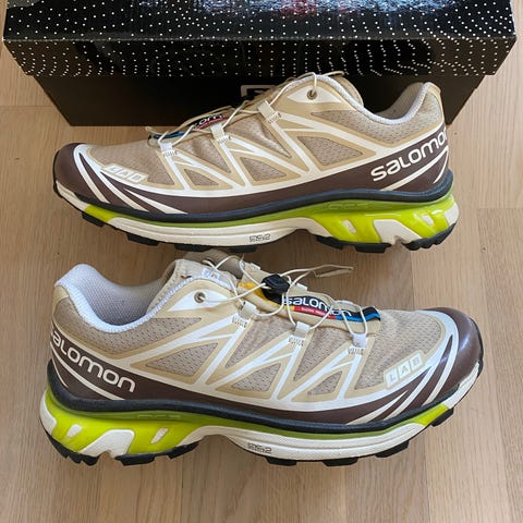 Salomon XT-6 løpesko i størrelse 45 1/3 Modellen er en teknisk løpesko med overdel i syntetisk materiale og tekstil, og yttersåle med grovt mønster tilpasset løping på variert underlag. Fargekombinasjon hvit med sorte og oransje detaljer. Skoene har hurtigsnøring foran og passer til løping og annen trening der det er behov for stabile og lette sko.