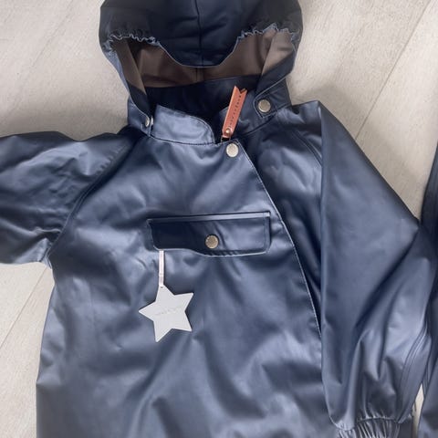 MINI A TURE foret regnjakke for barn i størrelse 98. Jakken er blå med ankermønster og laget i polyester. Den har hette, glidelås med knappestolpe foran og to frontlommer. Ermene har strikk ved håndleddene. Innside med mykt fôr for økt komfort. Unisex-modell som passer både gutter og jenter.