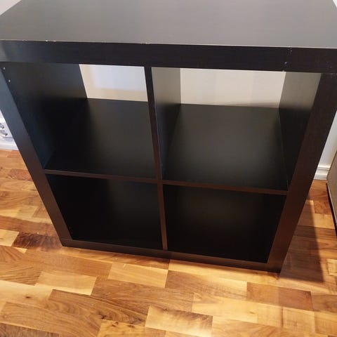 IKEA hylle med kuber og dører i brun finish. Hyllen består av fire åpne kuber, hvor to av dem er utstyrt med dører med runde knotter. Egner seg til oppbevaring av bøker, esker eller andre gjenstander i stue, soverom eller gang. Kan plasseres frittstående inntil vegg eller kombineres med annet oppbevaringsmøbel fra IKEA i lignende stil.