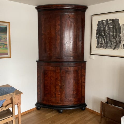 Stort, buet hjørneskap i flammebjørk/mahogny/kirsebær (?) selges. Usikker på hvor gammelt skapet er, men det har i hvert fall stått i det samme hjørnet i spisestuen i 75 år!