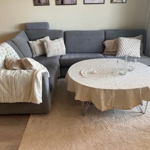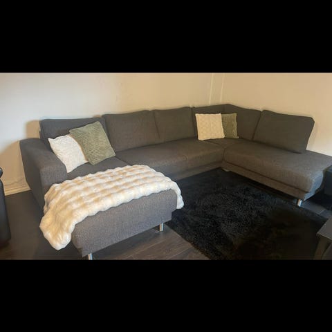 Hjørnesofa, bare brukt noen dager om vinteren. Står i et feriehus. Ingen synlige skader. Ikke røyk eller dyr!