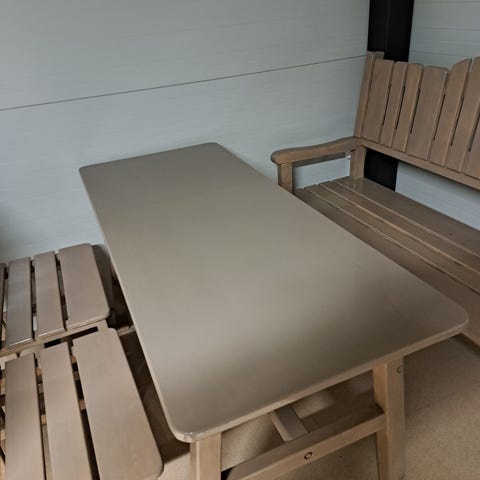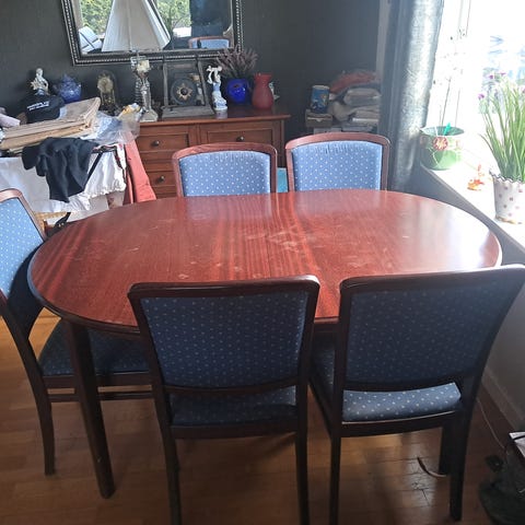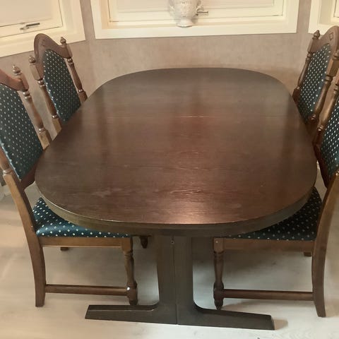 Stolene er veldig gode å sitte i, stoffet er helt, flekkfritt og pent, men kan enkelt (for den litt fingernemme) trekkes om til eksakt ønsket farge.