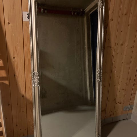 Speil med skuffeseksjon i tre i brun farge. Speilet har dreide stolper på sidene og utskåret topp. Nederst er det en liten hylleplate og to skuffer for oppbevaring av småting. Passer for plassering på kommode, bord eller annen benkeflate i for eksempel gang, soverom eller stue.