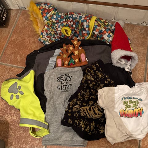 Sløyfesett med to sløyfer i rød og blå farge. Begge har justerbar stropp som kan tilpasses rundt halsen. I tillegg følger det med en klikker til hundetrening.
