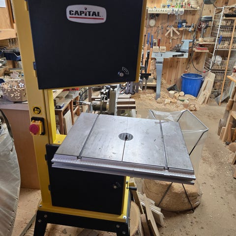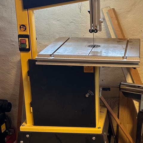 Stasjonær båndsag egnet for presisjonskutting i tre og andre egnede materialer. Maskinen har justerbart sagbord og føringer for nøyaktige snitt. På typeskiltet fremgår det at sagen er beregnet for 220–240 V, 50 Hz, med motoreffekt på 900 W (S6 40 %) og 450 W (S1 100 %), og nominell strøm på 4,0 A. Maskinen er beregnet for tilkobling til vanlig strømnett og har integrert bryter på siden.