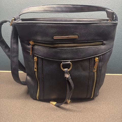 Fin blå håndveske med regulerbar skulder rem. 4 rom med glidlås i gullfarget. Brukt 1 gang. Fremstår som ubrukt
