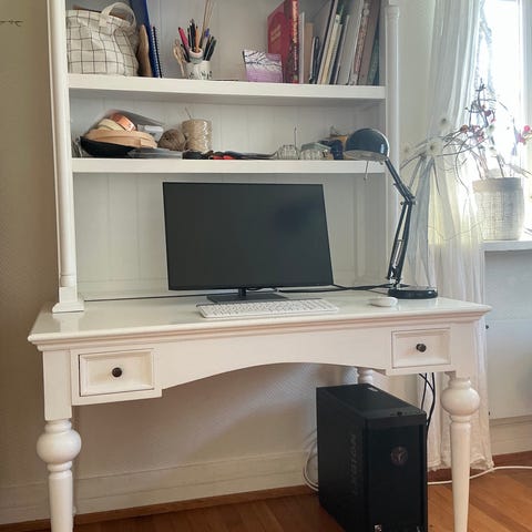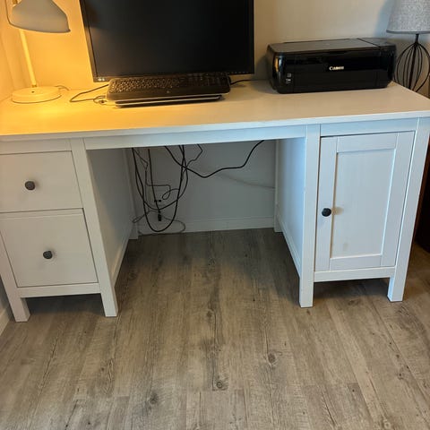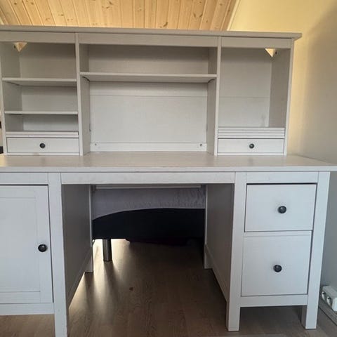 Noe flekker på skrivebord som ikke går bort, bordbeskytter kan fås med. Følger med overbygg til skrivebord som kan tas av.