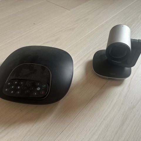 Settet består av konferansekamera, høyttalertelefon og tilhørende kabler/strømforsyning. Enheten er beregnet for videokonferanser og kombinerer kamera og lyd i én løsning. Kameraet har motorisert justering og kobles til datamaskin via kabel. Høyttalertelefonen har innebygde knapper for styring av samtaler og volum.