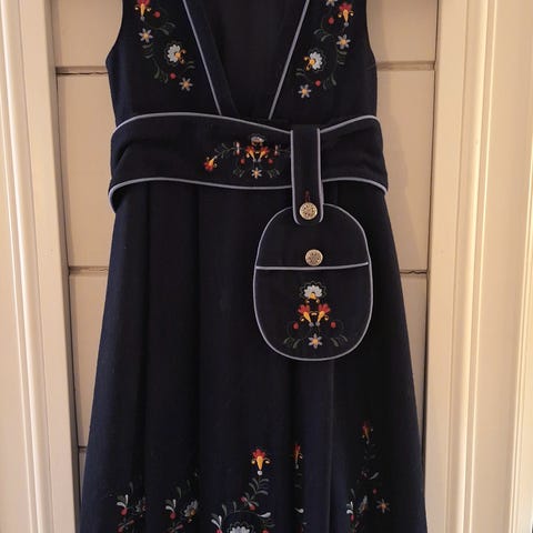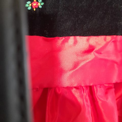 Pen 2 delt bunad/festdrakt. Uten skjorte. Rød og svart med pyntebånd og pene metallknapper.