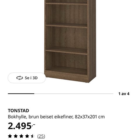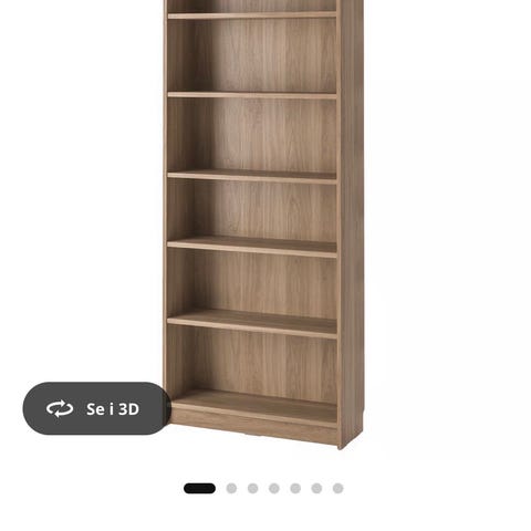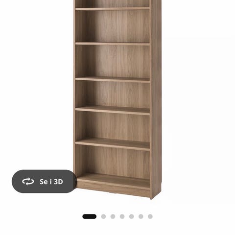 Selger Billy bokhylle fra Ikea i eikefarge.