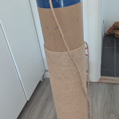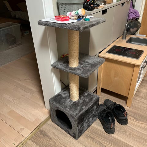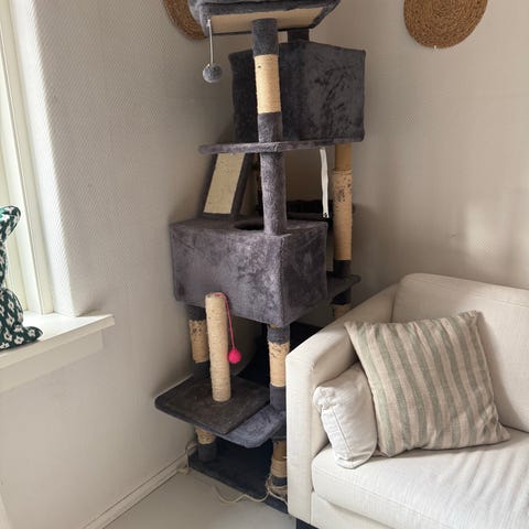 Klatrestativ til katt med flere liggeplasser i flettede kurver. Stativet har tre nivåer med runde kurver og myke puter i brun farge. Konstruksjonen består av en loddrett stolpe på en firkantet bunnplate for stabilitet. Øverste kurv er delvis lukket som en hule, mens de to nederste er åpne liggeplasser. Egnet som hvile- og klatremøbel for katt innendørs. Det er brukssporer og øverste kurv har hull i taket, men det kan fortsatt brukes. Det bør trekkes ny sisal på stolpene. Veldig stabil og tung. Må hentes! Første mann til mølla