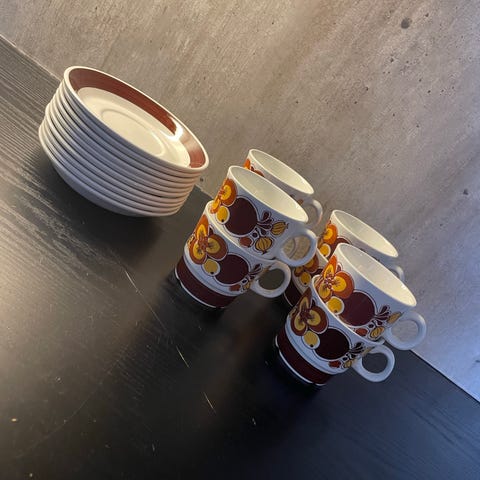 Rosenthal Studio-Line espressokopper med tilhørende asjetter. Serviset består av små kopper med skål, dekorert med flerfarget blomstermønster i gult, lilla og mørke toner. Koppene er merket «Espresso-Sammeltasse Nr. 20 G. Müller-Behrendt» på undersiden. Egner seg til servering av espresso eller andre små varme drikker.