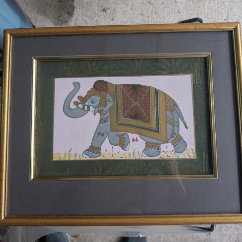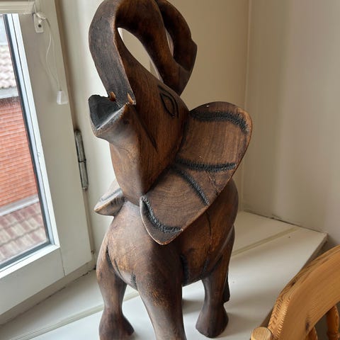 Elefantfigur i mørkt tre. Håndskåret dekorasjonsfigur med utskårne detaljer og lyse innfelte øyne og støttenner. Passer som pyntegjenstand på hylle, bord eller i vinduskarm.