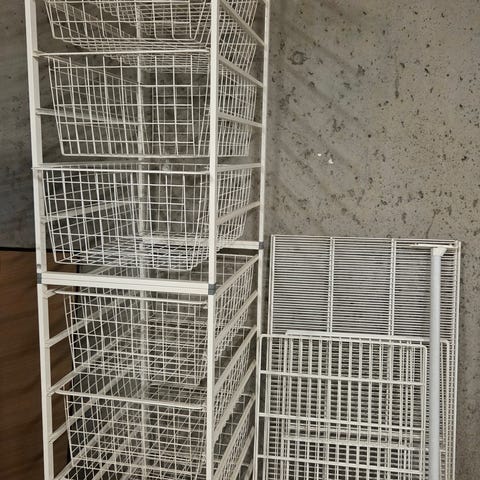 Elfa garderobesystem i hvit metall. Systemet består av veggskinner, bæreprofiler, trådkurver, uttrekkbare hyller og faste hyller. Løsningen gir oppbevaring for klær, sko og tilbehør i for eksempel gang, bod eller walk-in-garderobe. Oppsettet kan tilpasses ved å flytte og kombinere kurver og hyller etter behov. Det er også mulig å supplere med nye deler hvis man vil ha noe mer eller noe annet. Elfa har et enormt utvalg av praktiske og fine løsninger i ulike stiler. Selges på. mange butikker i Norge.