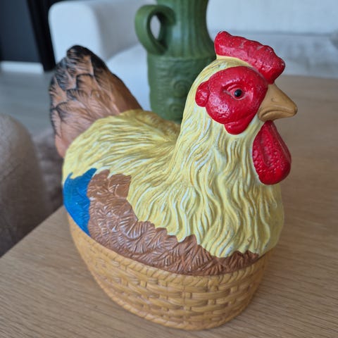 Denne koselige eggehønen er klar for å flytte til et nytt påskered! Hun trives best fylt med påskeegg, smågodt eller andre hemmelige skatter 🐣